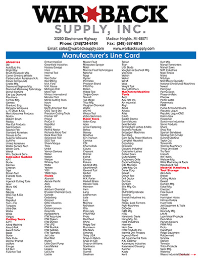 Established in 2016, War-Back Supply, Inc. is full-line industrial supply and fastener distributor, supplying a diverse array of products to meet your company’s needs. Along with several other products, War-Back Supply carries the most well-known and widely respected lines of tooling, machinery, fasteners, indexable carbide, material handling & storage, abrasives, metalworking fluids, cutting tools, plant & safety products, welding & plumbing supplies, power tools, and laser engraving.